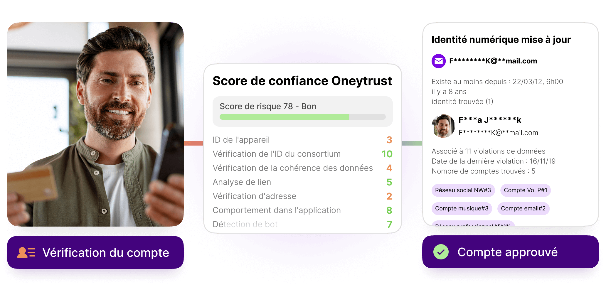 Bloquez la fraude à l'identité synthétique dès l’onboardingOneytrust croise ses données exclusives propriétaires avec des sources tierces et l'IA pour stopper faux profils avant qu’ils n’entrent dans votre base clients.